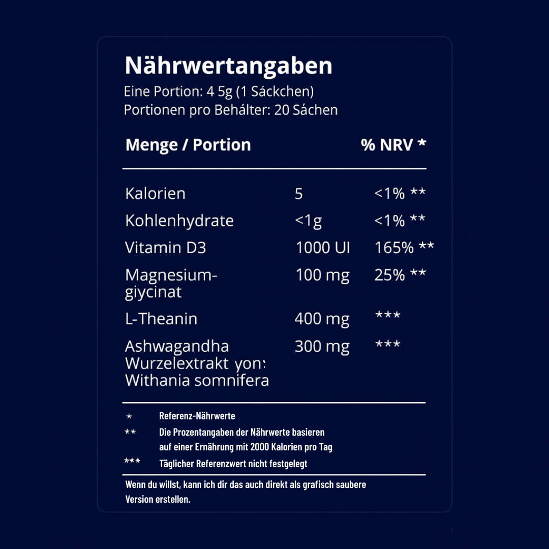 Ashwagandha senkt Cortisol messbar und beruhigt dein überaktives Nervensystem. Magnesium Glycinate stoppt Wadenkrämpfe und fördert tiefen Schlaf. L-Theanin bringt mentale Klarheit ohne Müdigkeit – perfekt bei ADHD. Vitamin D3 reguliert deine Stimmung von innen.